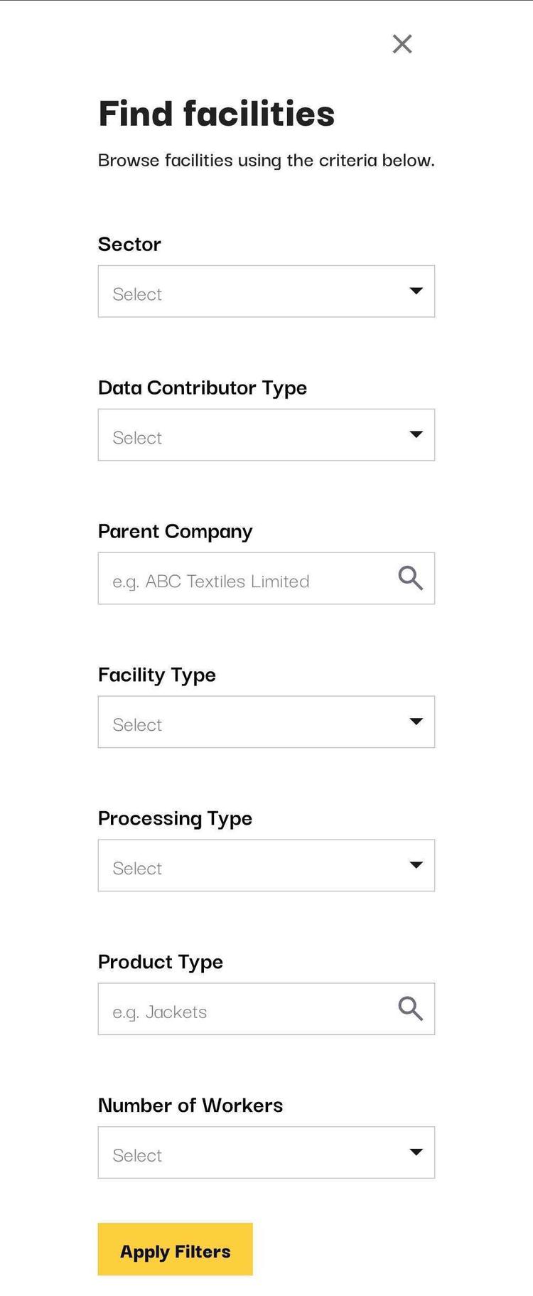 একাধিক নির্ণায়ক দ্বারা অনুসন্ধান করুন, যেমন সেক্টর এবং নির্দিষ্ট দেশ, দুই বা ততোধিক ব্র্যান্ডের দ্বারা অবদান করা কারখানাগুলি, বা ব্র্যান্ডের তালিকা এবং একটি নির্দিষ্ট দেশ।