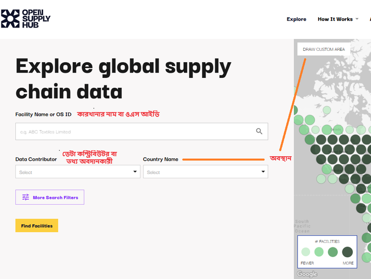 মানচিত্রে দেশ এবং/অথবা একটি নির্দিষ্ট এলাকা/অঞ্চল নির্বাচন করে [ড্র কাস্টম এলাকা] (মানচিত্রেই অবস্থিত) টুল ব্যবহার করে একটি নির্দিষ্ট স্থানে অবস্থিত কারখানাগুলিকে সীমিত করেও অনুসন্ধান করতে পারেন।