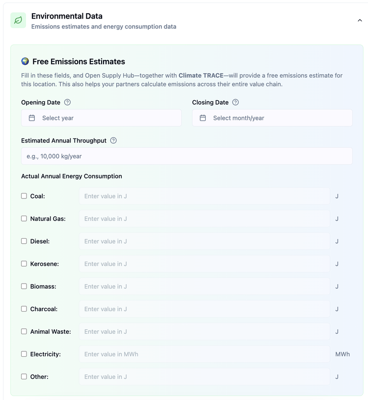 OS Hub's integration with Climate TRACE will automatically generate emissions estimates through a streamlined process: Climate TRACE will retrieve the facility data at regular intervals, calculate CO₂e emissions using their model, and return the results to OS Hub. After OS Hub's data moderation review, the emissions estimates will also be published on the approved claimed production location profile. Due to the review process, emissions estimates may take up to one month to appear on a profile.